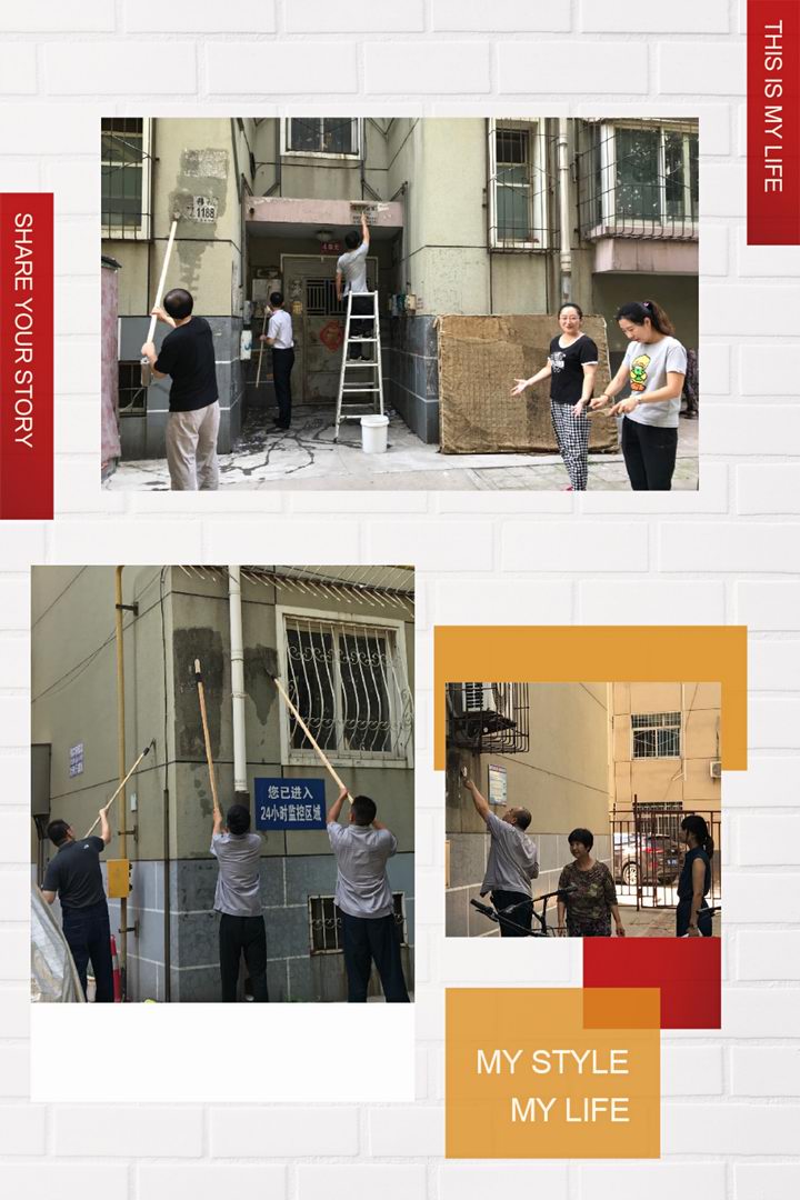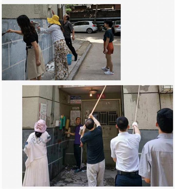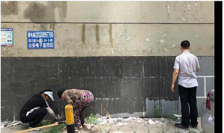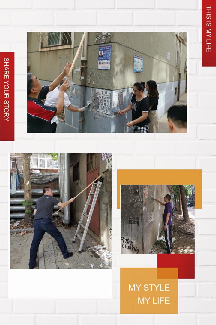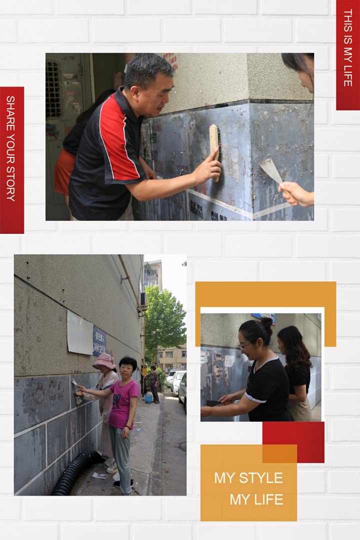 女同志們發(fā)揮優(yōu)勢耐心細(xì)致處理低處的小廣告,男同志們登高爬梯汗流浹背,沙子蹦到眼里、涂料濺到身上毫無怨言。