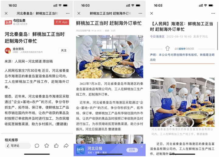 近日,人民網(wǎng)河北頻道、河北日報(bào)客戶端、今日頭條等各大媒體先后刊登了題為《河北秦皇島:鮮桃加工正當(dāng)時 趕制海外訂單忙》的新聞,對秦皇島富滋公司鮮桃加工業(yè)務(wù)進(jìn)行了宣傳報(bào)道。